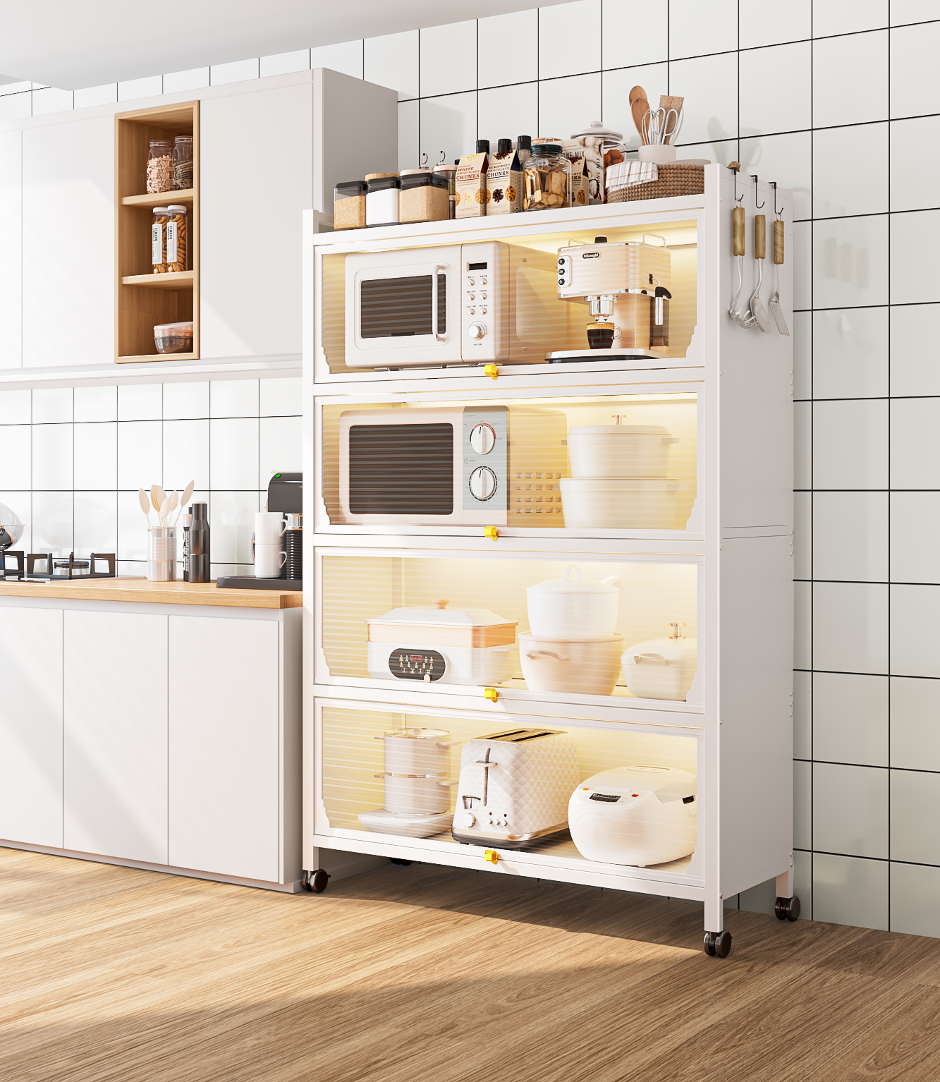 储物柜:碳钢材质;适用于客厅,收纳各种书籍,小物品;卧室,收纳书籍以及宝宝用品等,也适用于厨房。收纳各种厨房小家电以及餐具。