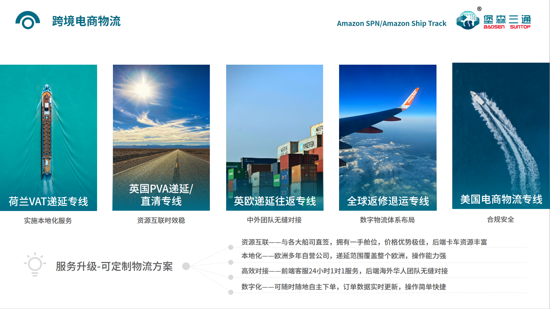 堡森三通在全球有14+分子公司,可实现本地化服务,中外团队无缝对接;20多年跨境物流经验,资源互联时效稳定,利用数字物流体系布局,合规安全。<br/>跨境电商物流专线:荷兰VAT递延,英国递延/直清专线,英欧递延往返专线,全球返修退运专线,美国电商物流专线等。