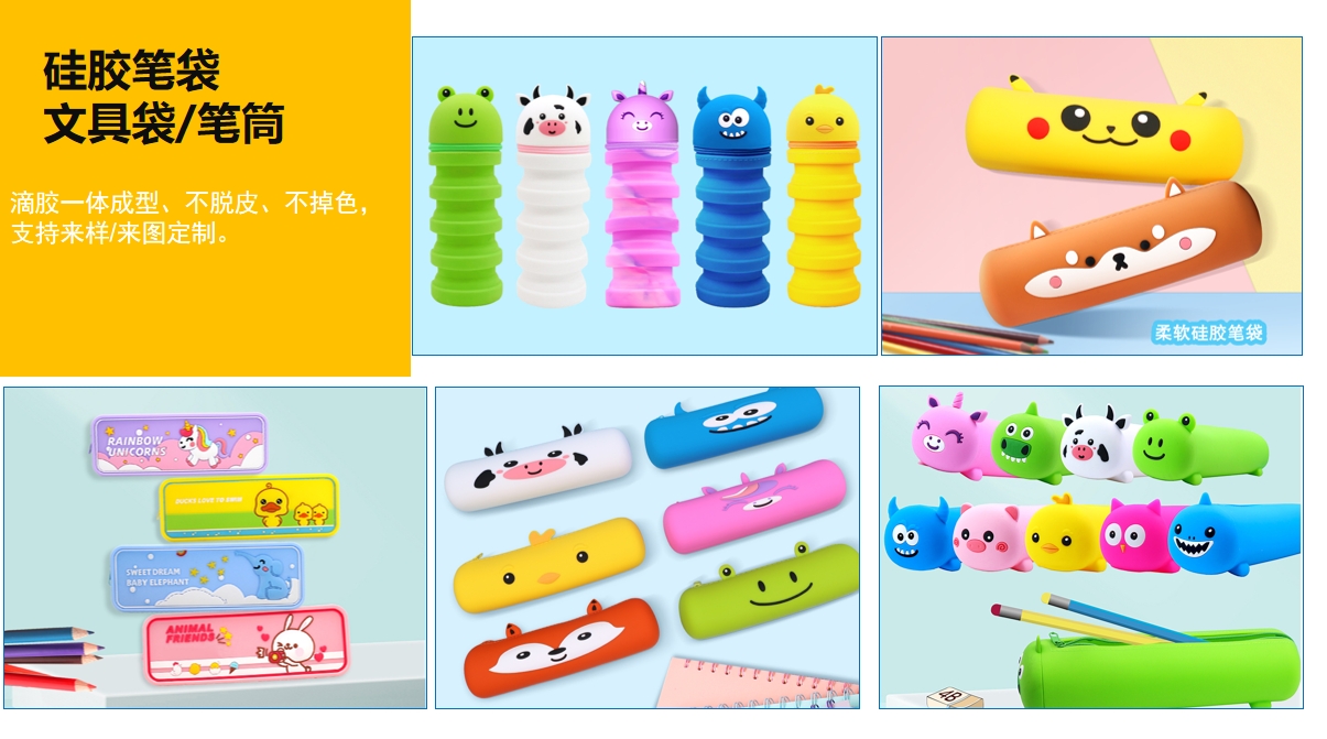主营产品有硅胶文具笔袋、硅胶包包、硅胶美妆工具、硅胶日用产品、PVC钥主营产品有硅胶文具笔袋、硅胶包包、硅胶美妆工具、硅胶日用产品、PVC钥匙挂件、盲盒公仔匙挂件、盲盒公仔、摆件等玩具礼品。